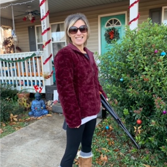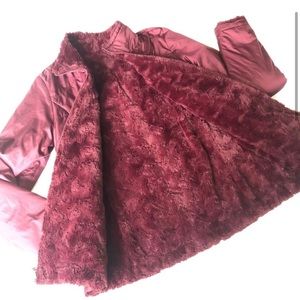 This jacket can be reversed and worn with the furry side in or out based on users preference. It’s a deep maroon color. I’ve worn it less than a handful of times. Super cute and super warm!