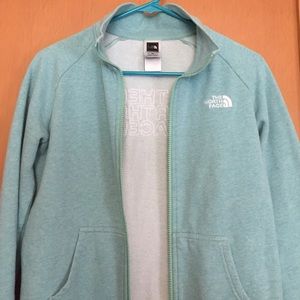 Northface zip-up jacket with sky blue cotton blend material, white logo stitching, and mint green zipper. Adorable color & thick material for extra warmth. No detectable flaws, size small.