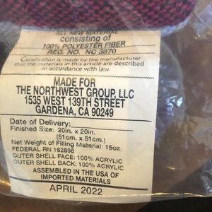Measures 20"W x 20"L; Shell is made of 100% Acrylic; fill is 100% Polyester
