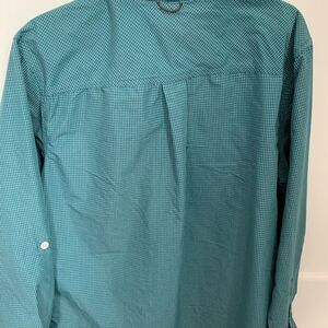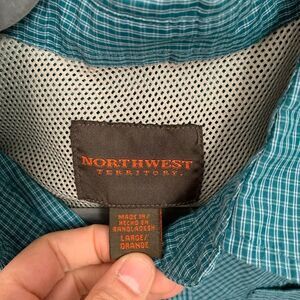 Men’s northwest territory, size large teal and white checked button down shirt, pit to pit is 23.5 inches length 26.5 inches, 24.5 inches sleeve length.
