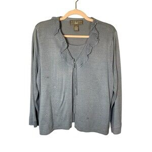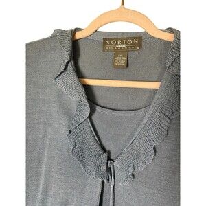 Elevate your wardrobe with this stunning Norton McNaughton sweater set, perfect for any occasion from travel to workwear. The lightweight silk material is adorned with exquisite floral patterns, ruffle accents, and sequin embellishments, making it a standout piece. The set includes a long-sleeved pullover with a round neckline and a matching attached sweater, both in a beautiful blue color.