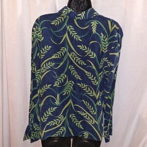 Stylish button-down shirt with a vibrant leaf pattern. Features a classic collar and button closure. Perfect for casual or formal wear. pit to pit size is 20" top of shoulder to bottom hem is 25" bundle more items for bigger deals Bin-132