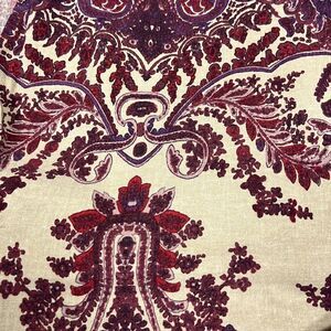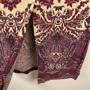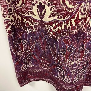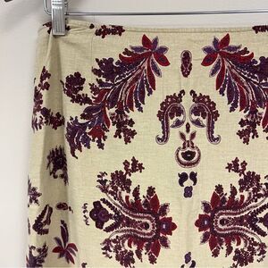 Elegant maxi skirt with intricate purple patterns. Soft cream background. Perfect for any occasion.