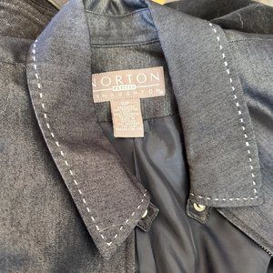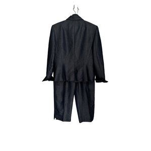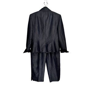 Norton McNaughton presents a navy blue pantsuit in size 10P for women. This two-piece suit features a zip front blazer, lined and with flip-up sleeves. Made from 65% rayon and 35% polyester.