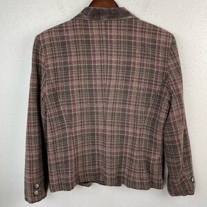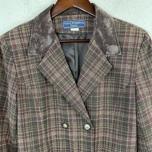 Love this stylish blazer by Norton McNaughton featuring a brown velour collar. It measures 20 inches armpit to armpit laying flat and is 25 inches in length from shoulder to hem.