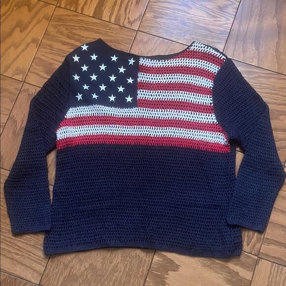 Show your patriotic spirit with this stylish navy and red sweater featuring an American flag design. Perfect for casual outings and cozy days.
