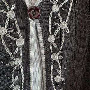Embroidery and bead accents. Classic never goes out of style. Chic charcoal cardigan with delicate embroidery. Perfect for layering.
