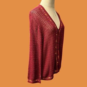 Deep red cardigan with muted orange accents in fantastic condition. The large weave allows the bottom layer to peak through, creating a greater depth to the style. No pulls or stains. Lots of natural stretch.
