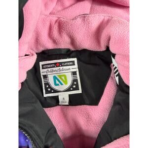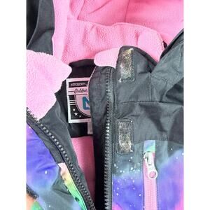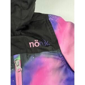 Sold at Scheels. Nordik kids hooded winter jacket featuring a vibrant rainbow galaxy print with black contrast panels and soft pink fleece lining. This insulated jacket includes a full zip front, attached hood, zip chest pocket, and two front pockets for everyday wear. Designed for cold weather comfort, the outer shell is durable while the interior fleece lining adds warmth and softness. A fun, colorful option for winter play, snow days, school, or outdoor activities. Size 4 (104 cm). Very good condition, velcro has some fuzzies and name on tag. Retail $130.