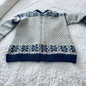 Norwegian 1980's Norway Wool Ladies Sweater Med Blue Cream Hand Knit Cardigan