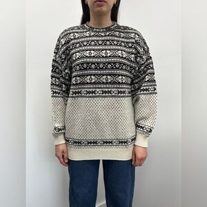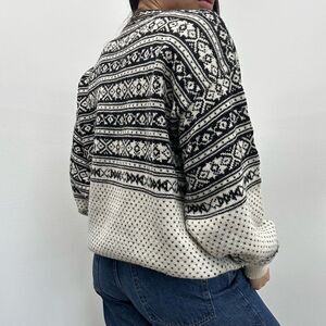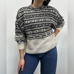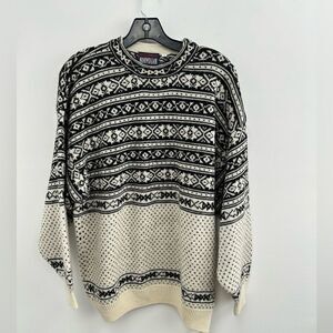 Norwegian Designs White & Black Fair Isle Pure New Wool Chunky Knit Sweater M
