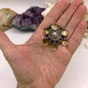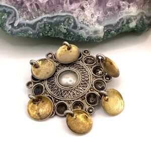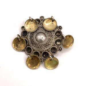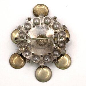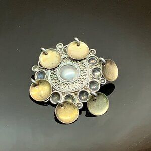 Nice circular 830 sterling silver brooch with many pretty gold color dangles. Marked P.S.R. 830S