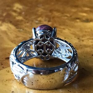 This solitaire ring is made with a genuine Thulite gemstone that was mined in Norway. The ring is set in solid .925 sterling silver with a rhodium finish. The ring in the photos is the actual one you will receive, so please see photos for gemstone quality and measurements. New, worn for photos only. Size 10.