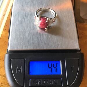 This pretty ring is made with a genuine 10x8 mm Thulite gemstone that was mined in Norway. The ring additionally has genuine ruby and white zircon accents. The ring is set in solid .925 sterling silver with a rhodium finish. The ring in the photos is the actual one you will receive, so please see photos for gemstone quality and measurements. Size 6.