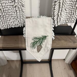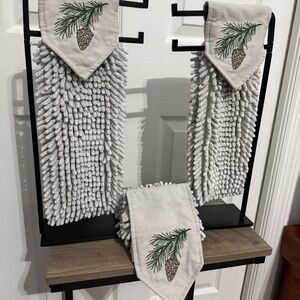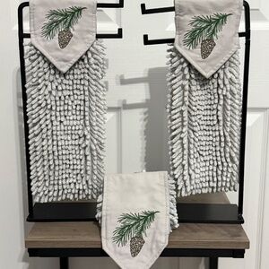Light gray Norwex handtowels with pinecone and pine branch embroidery. Set of 3.