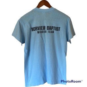 Norwood Baptist Mission Team Vintage T-Shirt Blue Size L Made In USA Irma 80's