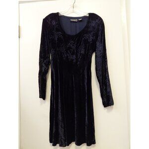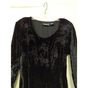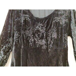 The Nostalgia black velvet dress is a stylish and edgy choice for those embracing a goth or witch aesthetic. Featuring a round neckline, long sleeves, this babydoll dress is perfect for parties or casual wear during the winter and fall seasons. Made from luxurious velvet fabric, the bodice has a floral type pattern with a solid black color, this vintage-inspired piece exudes a captivating charm. Chest measures 36" length 36". Great condition.