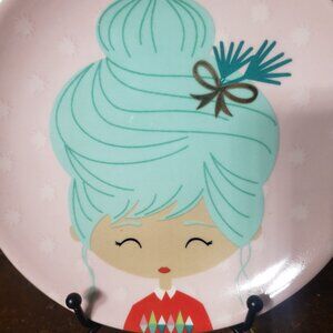 Adorable holiday plate -- features festive lady in a holiiday sweater - cup-cake hair on pink polka-dot background. Perfect for the girl's tea party in in December.