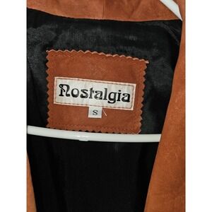 The Nostalgia Jacket is a vintage-inspired bomber jacket made of leather, featuring a short length and a snap closure. Perfect for travel, parties, or casual wear, the jacket is designed in a classic fit with retro 80s flair. The rust-colored jacket has accents of buttons and pockets, making it a stylish and functional choice for the winter, fall, or spring seasons.