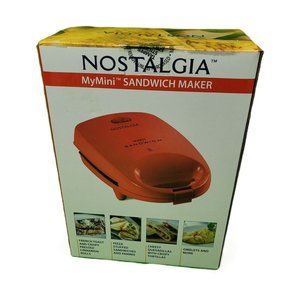 This Nostalgia MyMini Sandwich Maker is the perfect addition to your kitchen appliances. It is a square-shaped, electric grill and griddle pan that has a power source of 120V and 520W. This red sandwich maker is manufactured in China and weighs 2 lbs 1 oz.