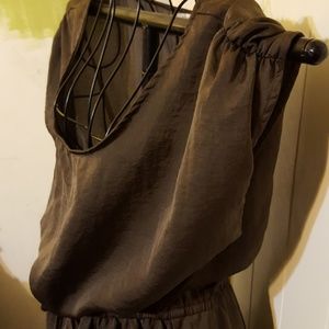 Only worn once! Olve green, tie waist, high/low hem line, gathering on the sholders, sleeveless (only worn once) Bust measures flat approximately 22", waist untied approx.17" but has elastic which can be stretched to appox 20"