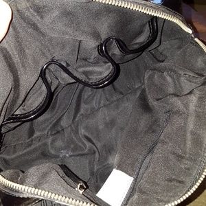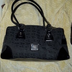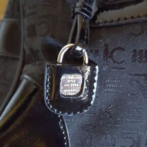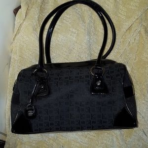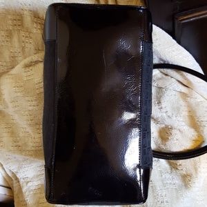 Really cute Signature Liz Claiborne black bag with fabric and patent leather. Pretty roomy for a small bag. Handles hang about 8". There are a few white marks on the bottom of the bag as shown in last picture maybe it will come off with alcohol not sure, but not noticeable. Overall the bag is in really good condition!
