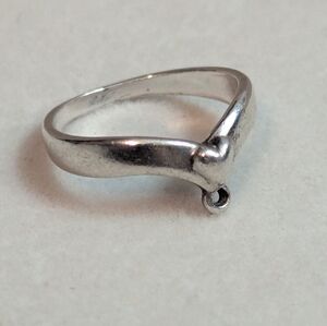 this size 4.5 women's ring is marked as sterling. sold as is. pretty loved. see pictures for weight and condition. can add a charm with jump ring.