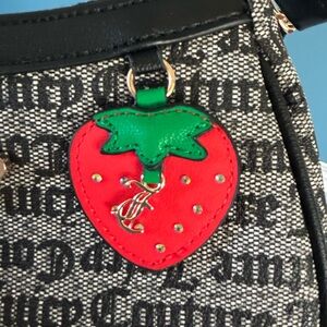 Chic Juicy Couture shoulder bag. Features black and white design. Accented with a playful strawberry charm.