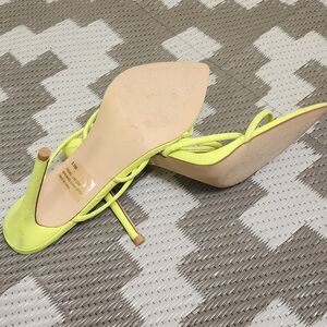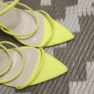Design: Stiletto heel with thin wrap-around straps and a pointed toe.