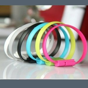 Brand new iPhone 5,6 charger bracelet. This is for the BLACK one. Simple design, snap in to make a bracelet- unsnap and plug into phone. Other end has USB adapter so you can plug it into a charger box, computer, laptop etc.. Get way to always have a charger with you!