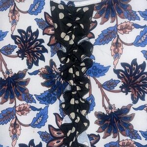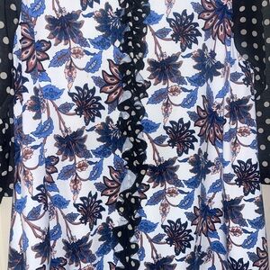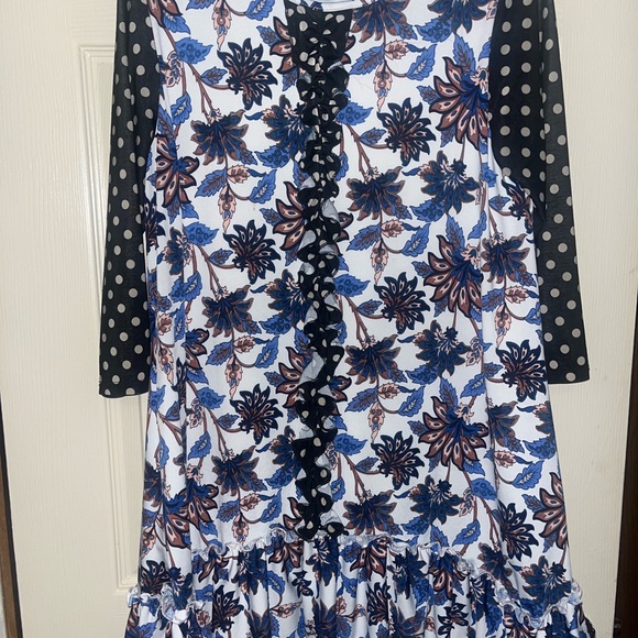 Stylish tunic from Zadie B with floral and polka dot patterns. Features blue, black, and white colors