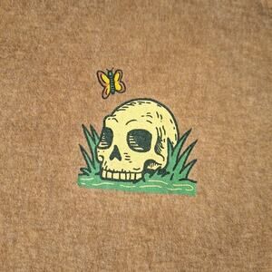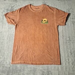 The Thrift Shop Exchange "Give The World Good Energy" Skeleton T-Shirt in size Medium is a stylish and bold addition to any wardrobe. Featuring a graphic print of a skeleton, this shirt is perfect for those who appreciate a spooky theme. Made of lightweight cotton material, this regular fit t-shirt is comfortable for everyday wear. The brown color and crew neck design make it versatile for both men and women who are looking to make a statement with their clothing.