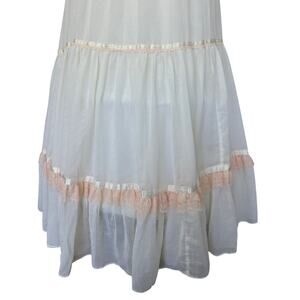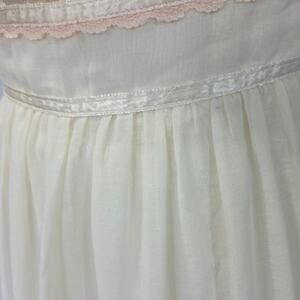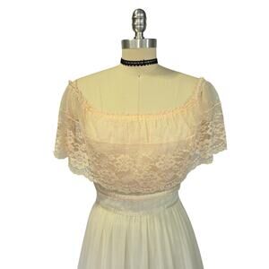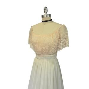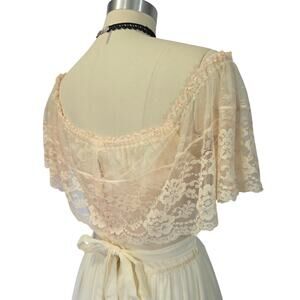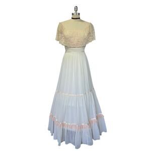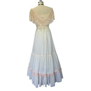 Vintage 70s Gunne Sax ivory cotton toile, satin and pink lace maxi dress with neckline that can be worn on or off the shoulder. In gently preowned condition, there are some picks and seam stress, see photos. No size tag, estimated a Gunnies size 13, see measurements for best modern fit. Hidden zip, tie back.