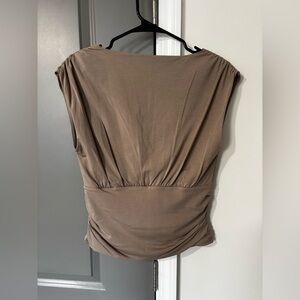 Chic tan blouse with a draped neckline. Soft fabric for comfort. Perfect for versatile styling.