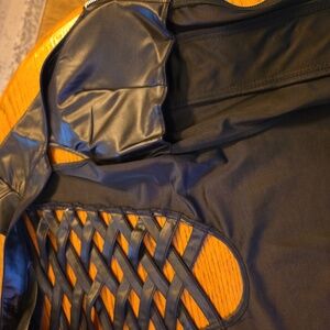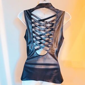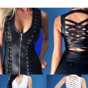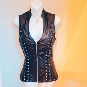 Stylish black faux leather vest with a zip-up front and eyelet details. Perfect for edgy outfits.