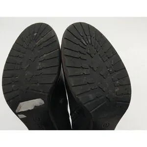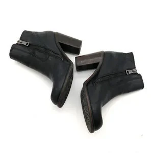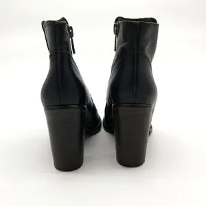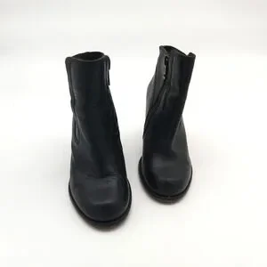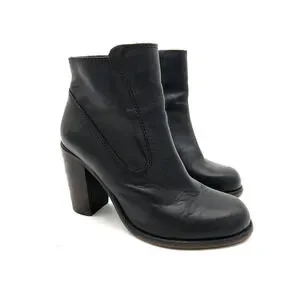 Allsaints black leather ankle boots with round toe, stacked heel, and side zip, size 39. Gently preowned, no noted flaws. May show light wear or scuffs from normal use. The heel measures about 3.5" tall.