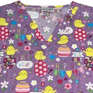 Excellent condition. Next to no sign of wear. Size tag missing, approximately a size 2XL 2 extra large. Measures 27.5 inches across the chest and 28 inches overall length. Please see all gallery photos. Features: cotton poly blend, short sleeve, v neck, front lower side pockets, straight back. Super cute scrub shirt top! Very bright & vibrant great for nurse, vet, tech, X-ray, lunch worker etc. Great for spring Easter season! Hoppy Day! Very pretty & super fun graphics. Please see all gallery photos. We are a smoke free, pet friendly home. Have a great day!