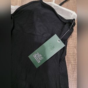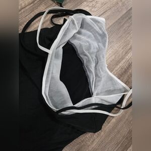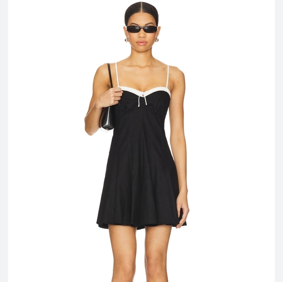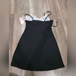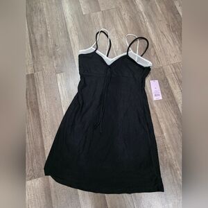 Stylish black mini dress featuring elegant white trim. Perfect for any occasion.