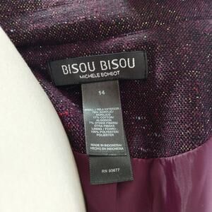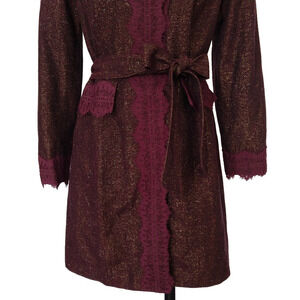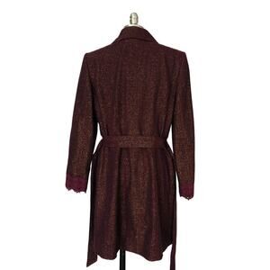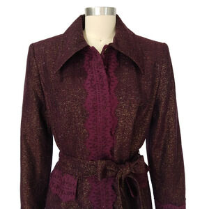 Vintage 2000s Bisou Bisou sparkle belted jacket with lace details in purpleish maroon multicolor tweed, size 14. Snap front closure.