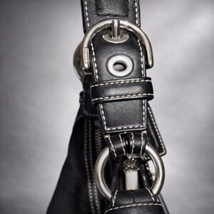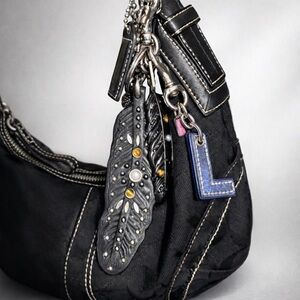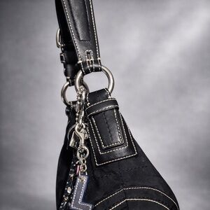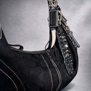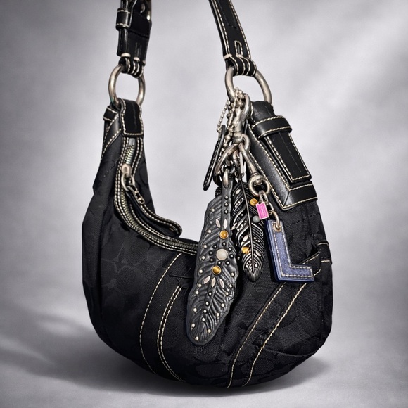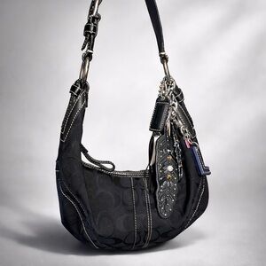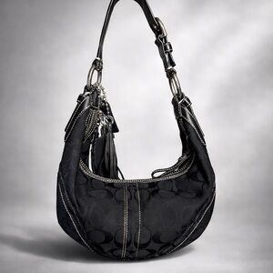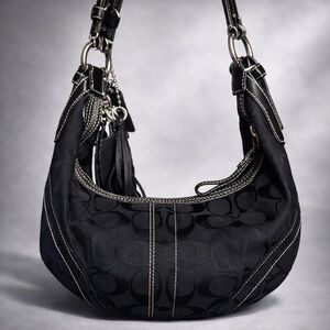 This is my first Coach purse. It is a Black 2006 Vintage Signature C Jacquard Soho Hobo bag with smooth leather trim, silver hardware, signature soho buckle on the short strap, small black hang tag with contrast stitching. My parents got myself, my sister, and my sister-in-law each a Coach bag for Christmas that year.