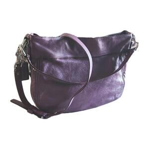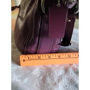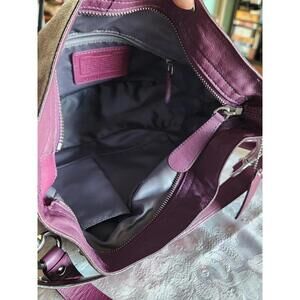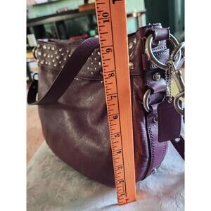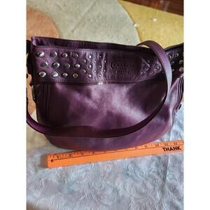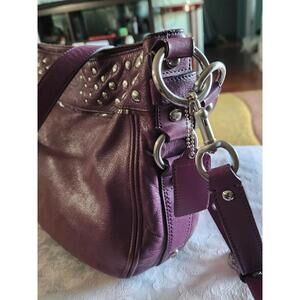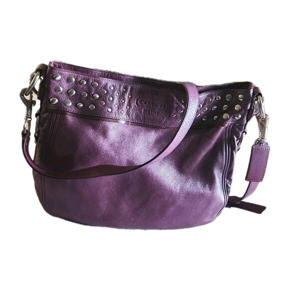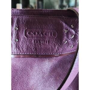 The Vintage Coach Purple Crossbody Shoulder Bag features a stylish design with silver studs adding a touch of edginess to the purple leather exterior. The bag has a zip closure and a fabric lining for added convenience. The purple handle/strap and silver hardware complement the overall aesthetic, making it a versatile accessory for any outfit. This Coach handbag is a timeless piece that combines vintage charm with modern style.