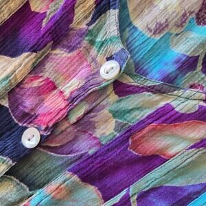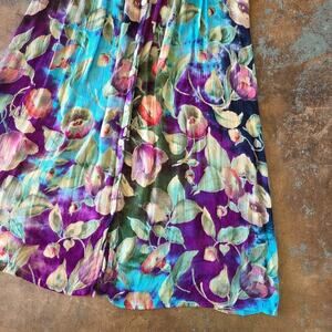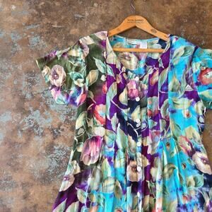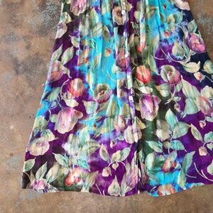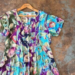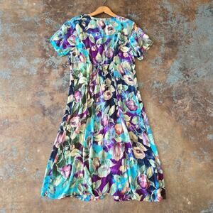 Vintage 1990s floral print midi dress in crinkle Rayon. Marked size extra large, see measurements for best modern fit. Button front, light removable shoulder pads, classic 90s tie back. In gently preowned condition, no flaws noted.