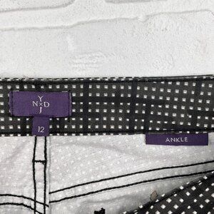 Elevate your wardrobe with these stylish and versatile pants from NYDJ. Perfect for casual or business occasions, these black, gray, and white check patterned pants feature a zip and button closure, flat front, and mid-rise fit. The tapered leg style and 27-inch inseam make them a fashionable and comfortable choice for women who wear size 12 with a waist size of 34 inches.