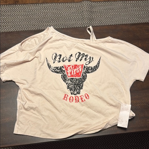 Stylish graphic tee with 'Not My First Rodeo' print. Features a bold bull design in black and red.