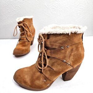 Not Rated Faux Fur Ankle Booties Brown Lace Up Block Heel Shearling Boots Sz 6.5