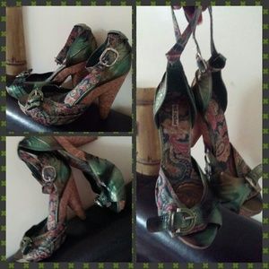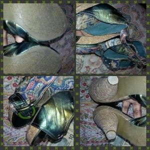 Muti Color/ 2 sided Sandle Paisley/ Pattened Sandel. Super Comfortable. Adjustable ankle strap, peeped, slight platformed with cork heels! This shoe is everything!??????