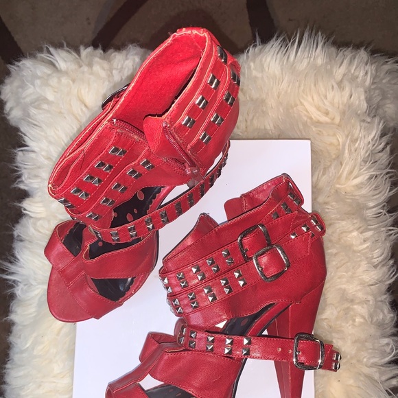 Faux leather , bright red, square silver studded straps with buckle, 3 in heel, inner ankle side zipper closure, ankle style, bottom strap can be worn up or loose around heel
