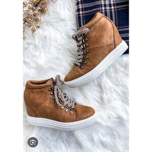 Not Rated TIBI Women's Size 7.5 M Hidden Wedge Sneaker Tan Brown Flannel Accent