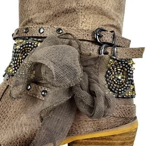 -Knee-high boot in marbled faux-leather featuring tulle, chains, and studded straps wrapped at ankle harness