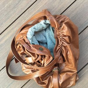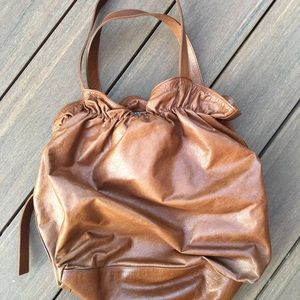 Gorgeous soft squishy leather in a beautiful cognac color. Striped cotton lining.